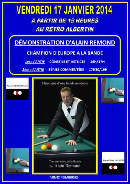 Ce vendredi 17 janvier , à partir de 16 heures, le Rétro Albertin accueillera le meilleur joueur français et Champion d'Europe à la bande : Alain Rémond.