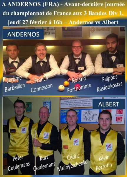 L'avant-dernière journée du championnat de France aux 3 Bandes Div 1 a lieu cette semaine et l'équipe d'Albert se déplace à Andernos-les-Bains le jeudi 27 février. Mathématiquement, la qualification pour la finale est encore possible mais il faudra à tout prix une victoire demain soir, restera alors un match contre Gravelines où il faudra également revenir vainqueur. Après la dernière journée, les 3 premières équipes du classement seront qualifiées.