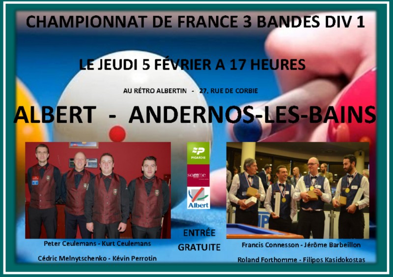 Jeudi soir à partir de 17 heures, lors de la 3ème journée du championnat de 3 Bandes Div 1 par équipes, l'équipe d'Albert reçoit celle d'Andernos-les-Bains (33). Ces 2 clubs occupent pour le moment les deux premières places de la poule, ce qui veut dire que ce match sera très déterminant pour la qualification.