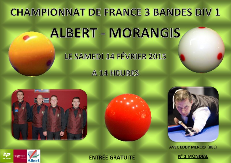 Hier soir, lors de la 3ème journée du championnat de France aux 3 Bandes Div 1 par équipes, l'équipe d'Albert s'est incliné à domicile contre Andernos-les-Bains sur le score de 8 à 0.