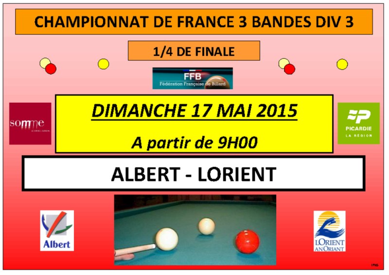 Dimanche à partir de 9h00, Albert reçoit Lorient pour un 1/4 de finale du championnat de France aux 3 Bandes Div 3 par équipes. L'équipe Lorientaise est emmenée par le jeune espoir Gwendal Maréchal qui évolue régulièrement à 1 de moyenne. Albert aura donc fort à faire pour venir à bout des Bretons. Les matchs se joueront sur 3 billards (2 sur les 3,10m et 1 sur le 2,80m)