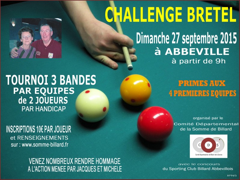 Le comité départemental de billard de la Somme organise un challenge en hommage à Michèle et Jacques Bretel, celui-ci se joue aux 3 Bandes par équipes de 2 joueurs, un tournoi à la Partie Libre 4 billes sera aussi organisé pour les jeunes débutants.