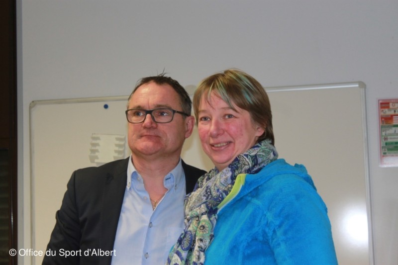 Alain Degardin (adjoint aux sports d'Albert) et Marie-Jo lors de la remise des médailles.