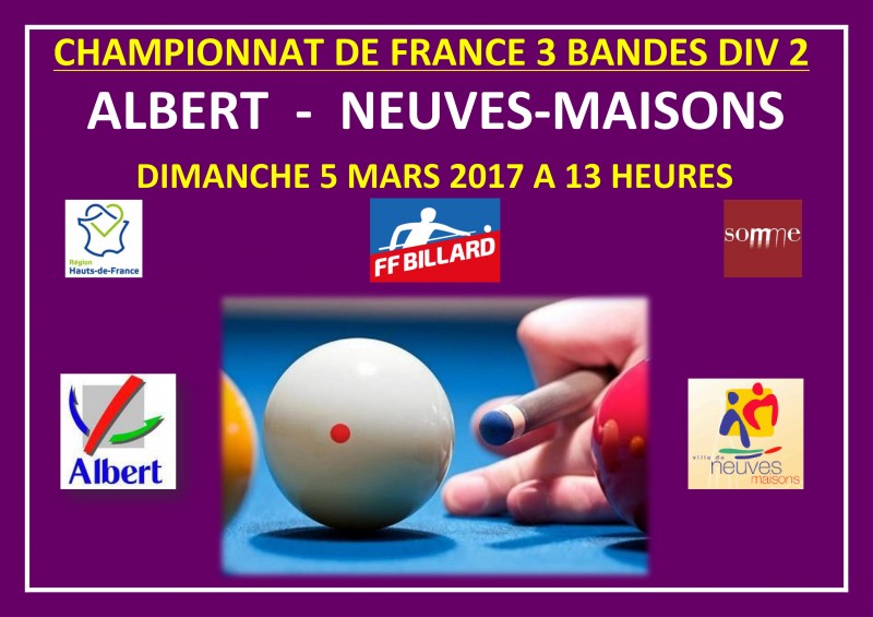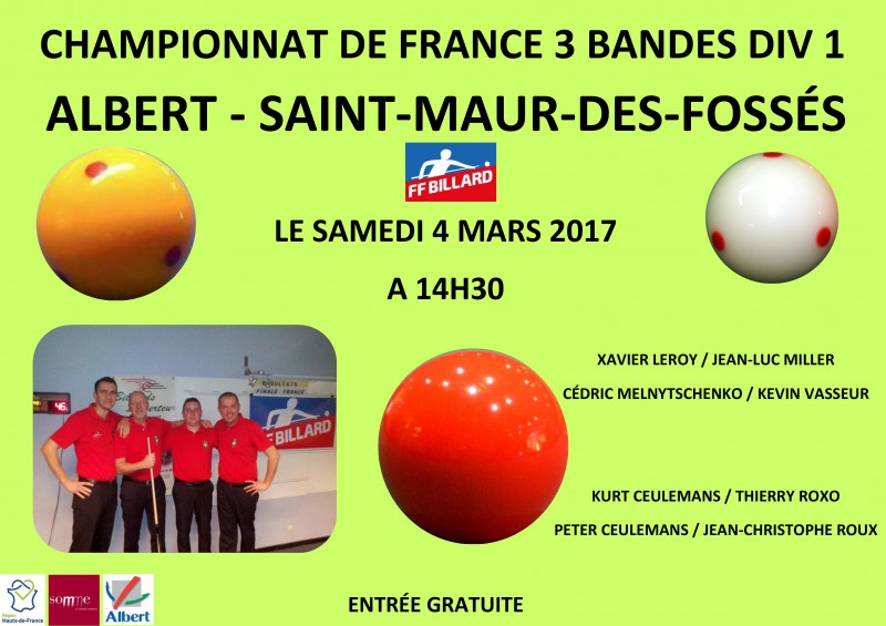 Samedi à partir de 14h30, Albert reçoit Saint-Maur-des-Fossés pour le compte de la 4ème journée du championnat de France aux 3 Bandes Div 1 par équipes.
