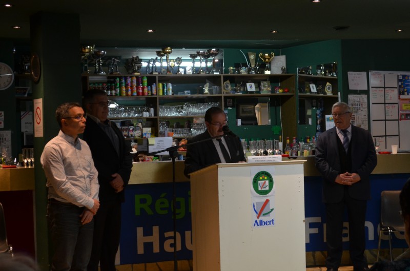 La cérémonie, très émouvante, avait lieu hier soir en la présence de Claude Cliquet (Maire d'Albert), Stéphane Demilly (Deputé), Alain Degardin (Adjoint au sport), Fernand Demilly (Sénateur honoraire), Nadine Haudiquet, Marc Dauchet, Philippe Hernas (membres de la commission sportive), Philippe Laffiliez (Président de l'office du sport), Pierre Reynaert (Vice-président de la FFB), beaucoup de dirigeants de clubs et de comités départementaux, les amis et la famille d'Alain et bien sûr les membres du club du Rétro Albertin.