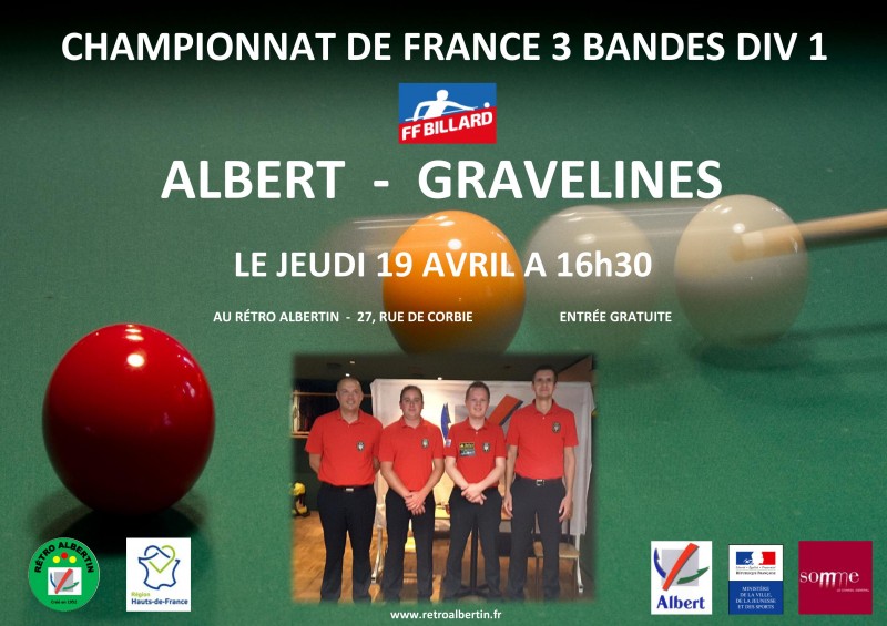 Demain à partir de 16h30, Albert recevra Gravelines pour le compte de la 6ème et dernière journée des qualifications du championnat de France aux 3 Bandes Div 1 par équipes.
