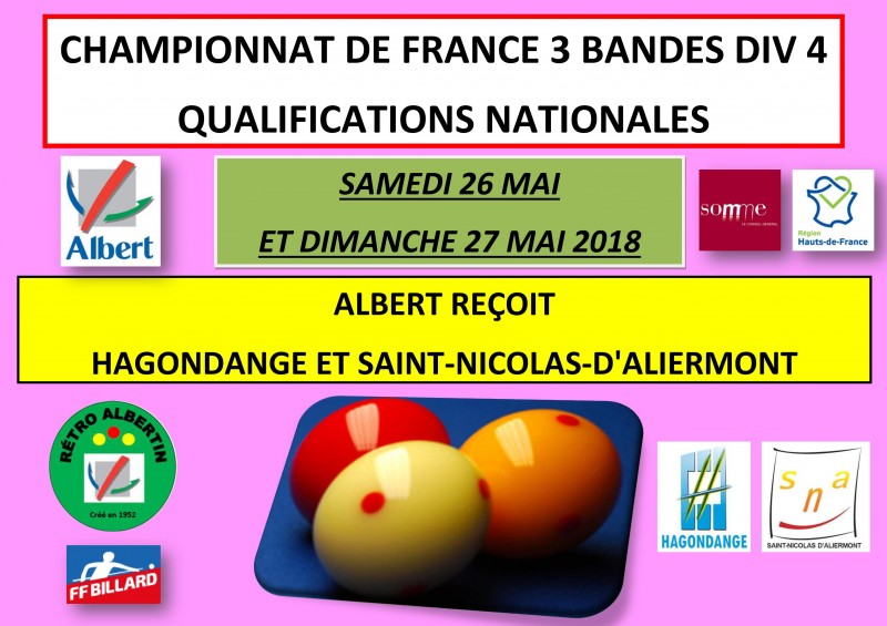 Samedi et dimanche aura lieu à Albert une qualification nationale du championnat de France aux 3 Bandes Div 4 par équipes.
