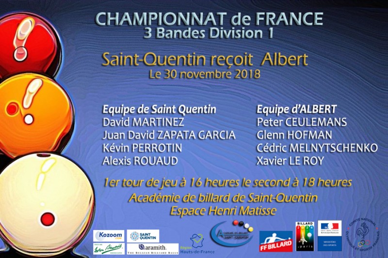 Vendredi, Albert se déplace à Saint-Quentin pour le compte de la 2ème journée du championnat de France aux 3 Bandes Div 1 par équipes. C'est la première année que l'équipe Saint-Quentinoise joue parmi l'élite, elle compte notamment dans ses rangs deux joueurs Espagnols de haut niveau.