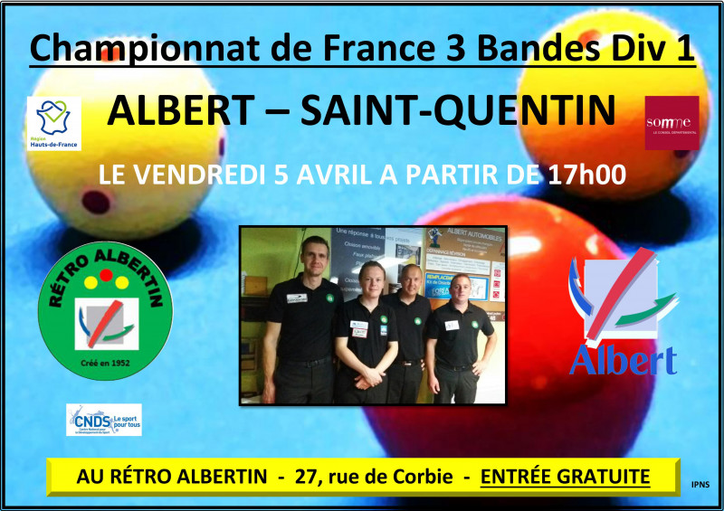 Vendredi, Albert reçoit Saint-Quentin pour le compte de la 6ème et derniére journée du championnat de France aux 3 Bandes Div 1 par équipes.