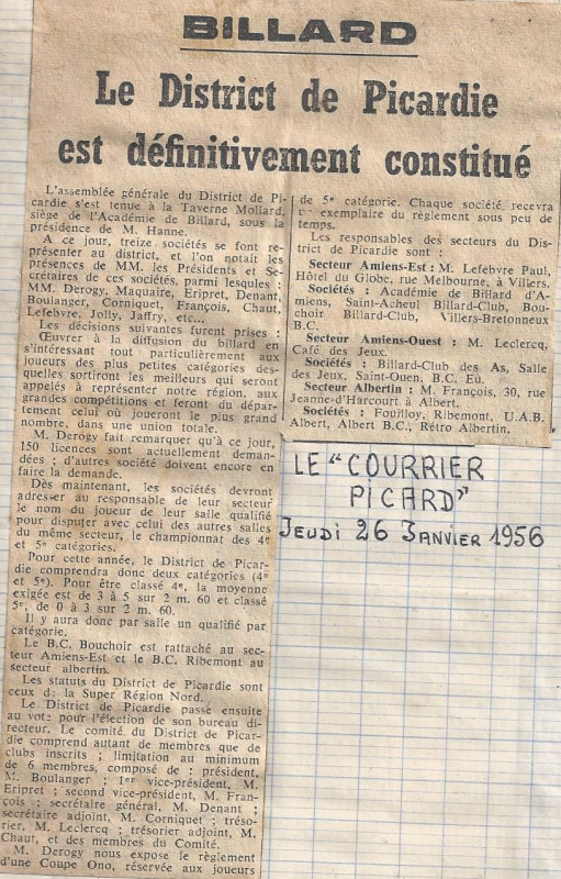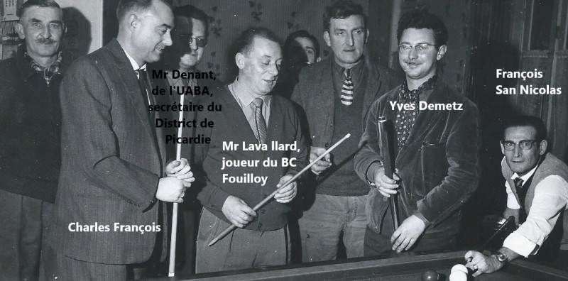 Le club phare de ces années est le Billard Club des As à Amiens, présidé par Maurice Derogy, et qui compte dans ses rangs les meilleurs joueurs du département, Mrs Develenne, Descheerdeer, mais aussi un certain Jean Thuillier, qui « migrera » par la suite au Rétro Albertin. Il y a d’ailleurs 5 autres clubs à Amiens avant 1960, avec l’Académie de Billard d’Amiens,le BC Hotoie, le St Acheul BC, le BC Saint Roch et le Café des Jeux.