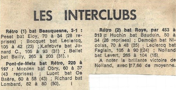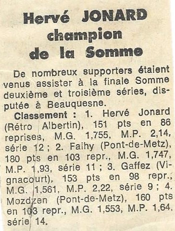En 1977, la Fédération Française de Billard  confie au District de la Somme l'organisation du  championnat de France à la bande 1ère catégorie nationale. Cette épreuve réunit l’élite actuelle de la catégorie dont les deux picards, Alain Jonard et Jacques Perimony (Amiens).