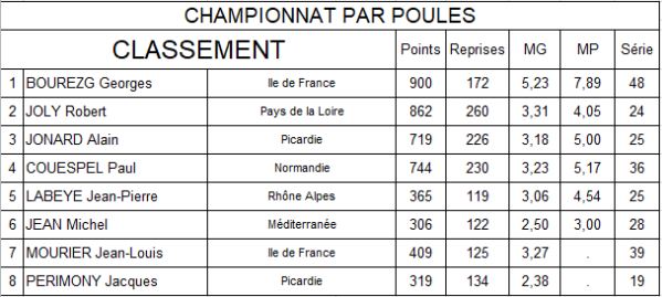 La compétition se déroule au centre Pierre de Coubertin à Amiens les 12 et 13 mars, les huit participants seront divisés en deux poules. Alain Jonard, après s’être qualifié pour le carré final, prendra la 3ème place du championnat, la médaille d’or étant logiquement remportée par le favori, Georges Bourezg (Paris), au-dessus du lot tout le week-end. Encore une belle médaille pour Alain !