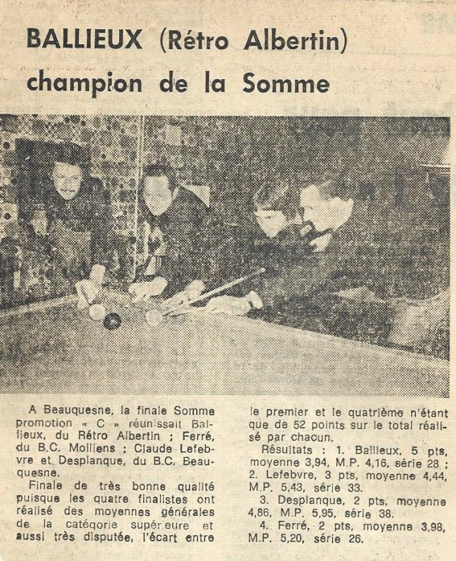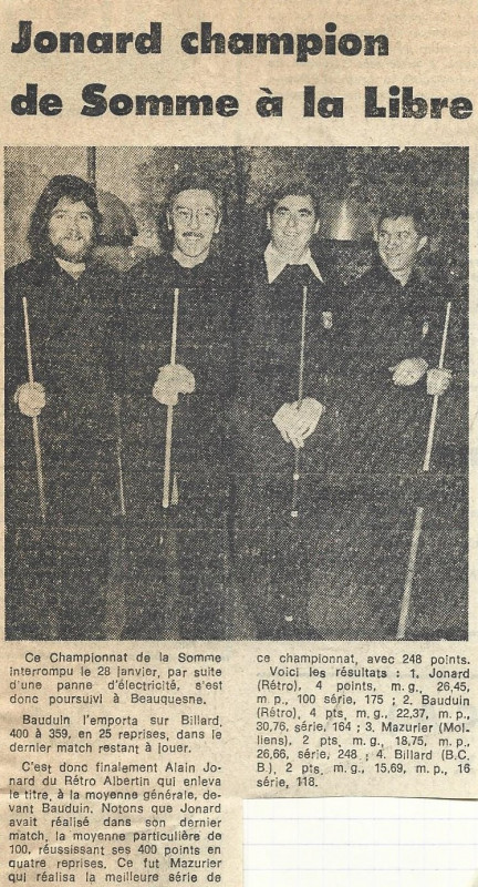 En 1979, une finale départementale à la partie libre 1ère catégorie et réunissant 4 joueurs qui se sont souvent affrontés. Cette fois-ci c'est Alain Jonard qui s'impose devant son ami Claude Bauduin. Les 2 albertins se qualifieront en finale du secteur Nord, mais Alain finira second derrière le nordiste Jean-Pierre Brion. Au cours de cette finale , Alain réalisera 31 de moyenne générale et la série de 300 face à un jeune Soissonnais...... Patrick Dupont.