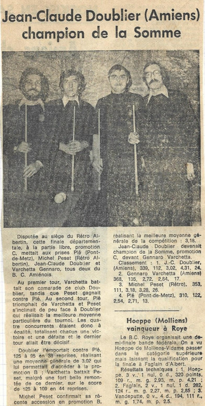 Michel Peset termine 3ème de la finale départementale en promotion C en décembre 1979 et accède la même saison en promotion B. C'est Jean-Claude Doublier, à l'époque joueur du club d'Amiens qui s'impose.