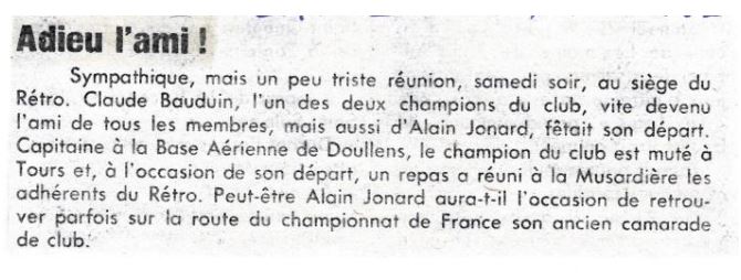 En effet, les obligations militaires imposent à notre jeune champion une mutation pour la ville de Tours. Une soirée d'au revoir est organisée au club, bien triste car Claude, de par sa nature souriante et attachante, s'était très bien intégré dans la famille du Rétro Albertin. Plus jamais il ne rencontrera Alain Jonard en compétition, mais par contre, il croisera la route de son 4ème fils quelques années plus tard dans la catégorie Master, notamment à Albert (17 ans plus tard...)