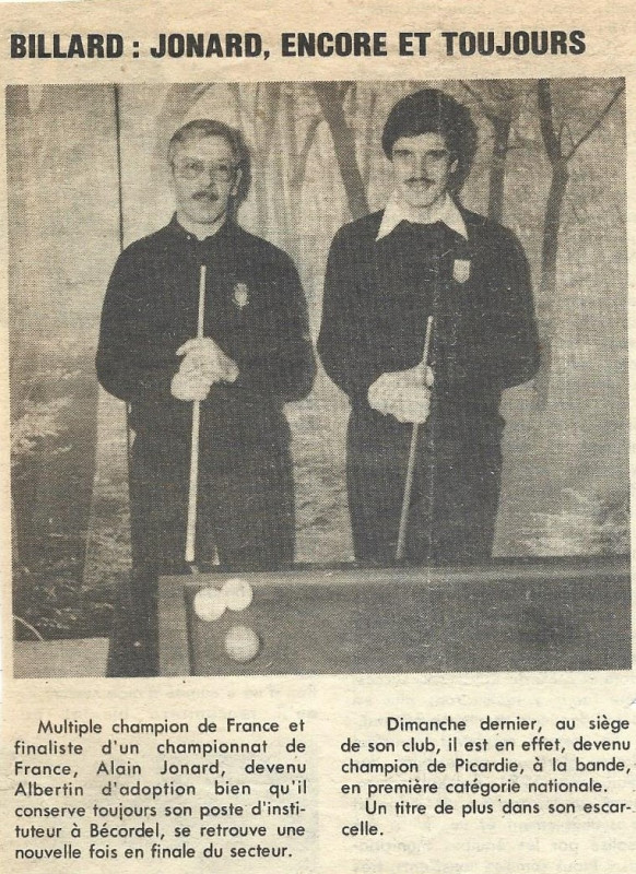 Tout cela n’empêche pas Alain Jonard de se qualifier encore une fois en finale de France à la bande 1ère catégorie nationale en remportant à domicile la finale du secteur Nord, après avoir remporté la finale de Picardie face à Patrick Dupont.