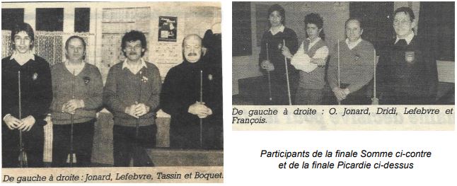 Dès la saison suivante, Olivier Jonard remporte, à la bande 4ème catégorie, les titres de champion de Somme à l’UABA, de Picardie au Rétro Albertin et du secteur Nord à Troyes et se qualifie pour la finale de France qui se joue à La Baule les 27, 28 février et 1er mars 1987.