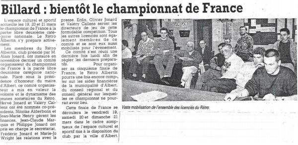 Mais le point d'orgues de cette saison est l'organisation d'un nouveau championnat de France de billard à Albert. La Municipalité d'Albert, conduite désormais par un jeune Maire dynamique, Stéphane Demilly, a fait construire une salle exceptionnelle juste à côté de la Mairie : le Théâtre du Jeu de Paume. Les membres du Rétro Albertin vont accueillir 8 joueurs venus de la France entière pour disputer la finale nationale à la partie libre 2ème catégorie. La fête ne peut qu'être réussie dans une enceinte aussi magnifique.
