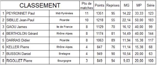 Après les cinq premiers tours, Didier compte trois victoires et deux défaites, ce qui lui permet d’espérer un podium. Malheureusement au tour suivant, il perd un match important contre Pierre Rigollet. Il remporte une 4ème victoire lors du dernier tour devant un public nombreux mais ce ne sera pas suffisant pour accéder au podium. A égalité de points avec le 3ème et le 4 ème, Didier, battu à la moyenne, prendra la 5ème place du championnat. C’est Paul Peyronnet de Levelanet (Ariège) qui est déclaré champion de France par Jean-Louis Le Quéau, délégué fédéral.