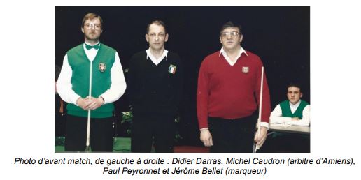 Parmi eux, un sociétaire du club en pleine progression, Didier Darras, va relever le défi et tenter de concrétiser ses belles dernières performances. Didier, désigné comme invité du club, sera opposé à sept concurrents venus de la France entière. Il participe à son 3ème championnat de France après une finale à la bande sous les couleurs de Molliens-Vidame et une au 3 bandes la saison passée.