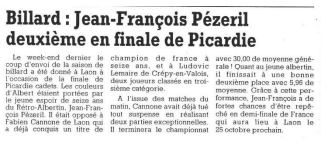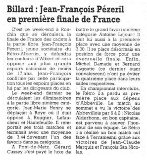 Lors de la saison 1992-1993, l'école de billard du Rétro Albertin voit progresser ses jeunes membres. Parmi eux, Jean-François Pézeril commence à se faire un nom dans le département et est engagé dans les compétitions nationales cadets et va effectuer un parcours remarquable. Pour arriver en finale de France, Jeff passe d'abord par une finale régionale dans laquelle il termine 2ème derrière Fabien Canonne.