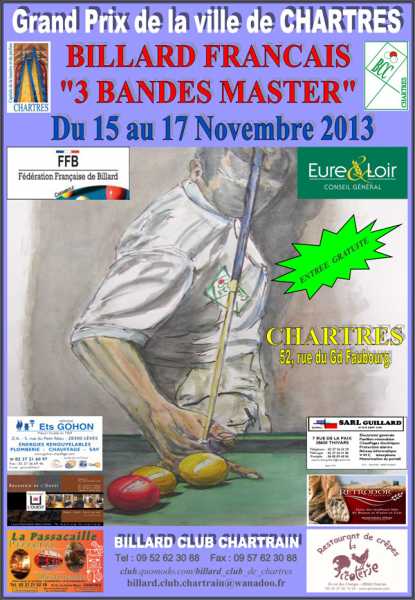 C'est à Chartres qu'à lieu ce week-end le 2ème tournoi national aux 3 Bandes, 56 joueurs ont été retenus, la compétition démarre vendredi dès 8h00 par les préqualifications. Étant tête de série n°4, Cédric est directement qualifié pour le tournoi principal et jouera son premier match samedi en début d'après-midi.