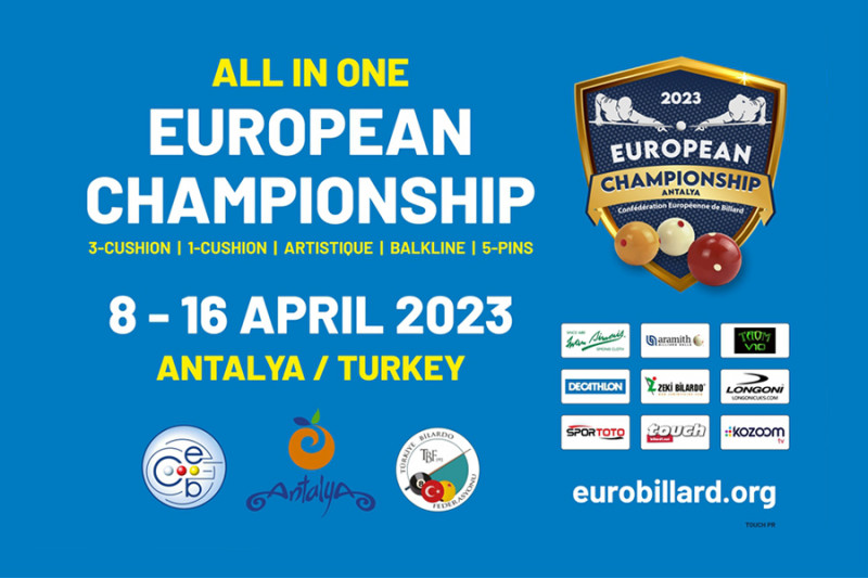 Les championnats d'Europe regroupés se déroulent cette saison sur neuf jours du 8 au 16 avril à Antalya en Turquie où quinze titres européens seront décernés dans toutes les disciplines, genres et catégories d'âge du billard carambole.