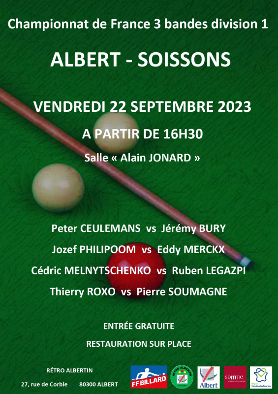 Vendredi à partir de 16h30, Albert reçoit Soissons pour le compte de la première journée du championnat de France par équipes au 3 bandes division 1.