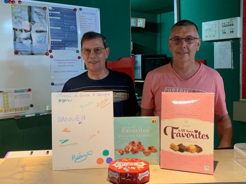 Dominique Lécu et Hervé Jonard devant les cadeaux offerts par les élèves. (Éric Huchin, indisponible le jour de la photo)