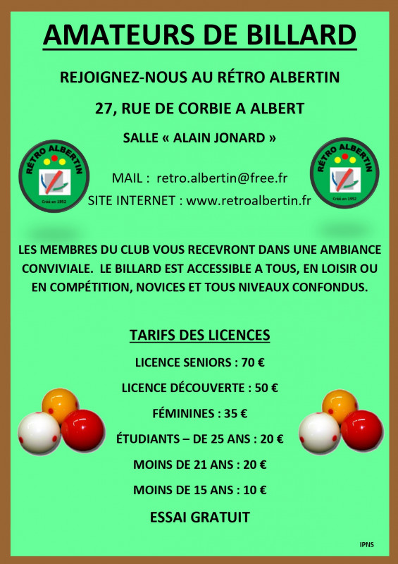 Sur le plan sportif, dernièrement le Rétro Albertin a décroché deux médailles lors des finales des championnats de France au 3 bandes par équipes, une en bronze en division 3 et une en argent en division 2 enrichie d'une accession en division 1. A cela, il faut aussi ajouter en individuel trois titres de champion de la Somme et une participation en finale de France.