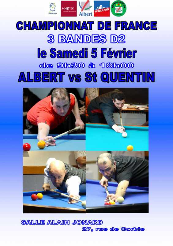Samedi, l'équipe du Rétro Albertin engagée dans le championnat de France par équipes au 3 bandes division 2 reçoit la très jeune équipe de Saint-Quentin (moins de 25 ans de moyenne d'âge) en match aller retour.
