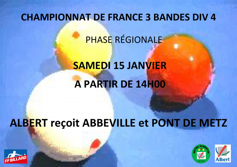 A Abbeville, l'équipe d'Albert bat Saint-Quentin sur le score de 4 à 2 avec des victoires pour Albert de Frédéric Jonard et Valéry Callens. Le deuxième match contre Vignacourt tourne largement à l'avantage d'Albert puisque les trois joueurs albertins remportent leur rencontre. La plus belle partie de la journée a été réalisée par Valéry Callens avec 30 points en 24 reprises soit 1,250 de moyenne, Valéry réalise tout juste 1 de moyenne sur ses deux matchs. Romain Leduc (Saint-Quentin) est aussi auteur d'une belle partie à 1 de moyenne sur 2,80m.